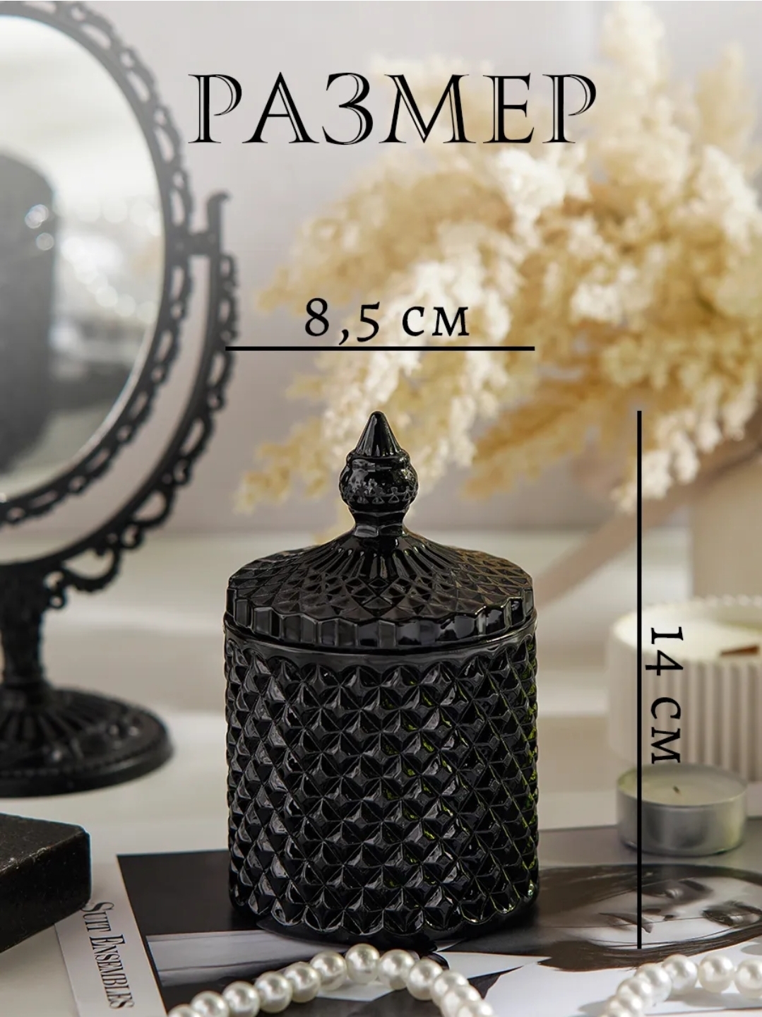 Высота свечи с крышкой примерно 14 см, диаметр 8,5 см.